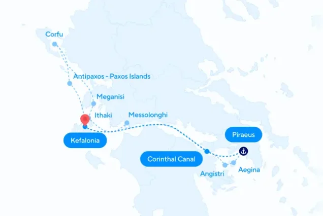 Canal de Corinto – Kefalonia – Paxoi – Ithaca – Corfú – Angistri – Aegina